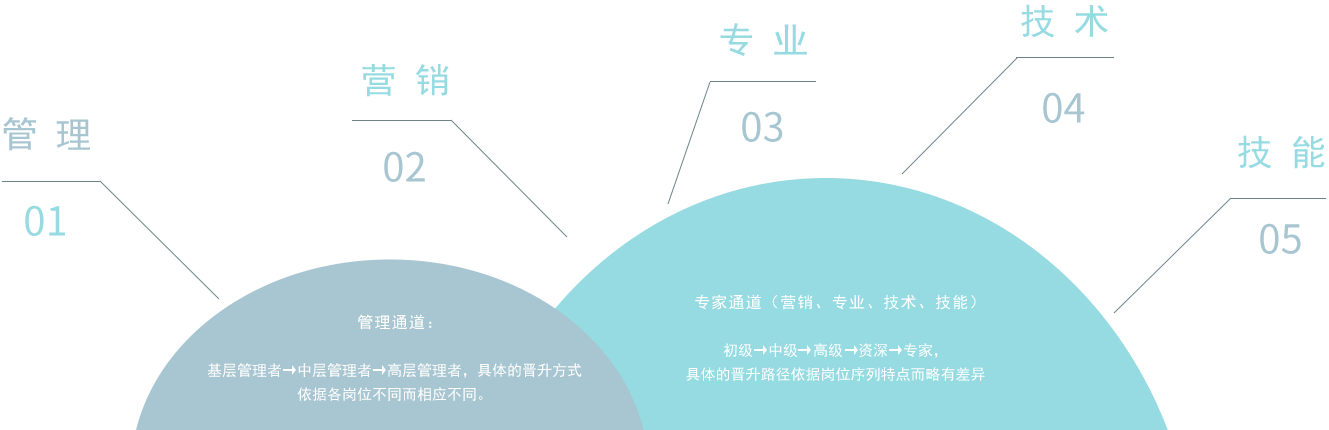 職業(yè)發(fā)展路徑包括管理、營(yíng)銷(xiāo)、專業(yè)、技術(shù)、技能五個(gè)通道路徑,可根據(jù)自身職業(yè)發(fā)展規(guī)劃選擇在相應(yīng)路徑上不斷成長(zhǎng)發(fā)展,也可在成長(zhǎng)過(guò)程中,結(jié)合自身意愿,通過(guò)自身努力,跨路徑成長(zhǎng)