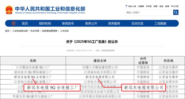 近日,工業和信息化部公示《2025年5G工廠名錄》,新遠東電纜有限公司憑借在5G技術應用與工業互聯網融合發展方面的突出表現成功入選。